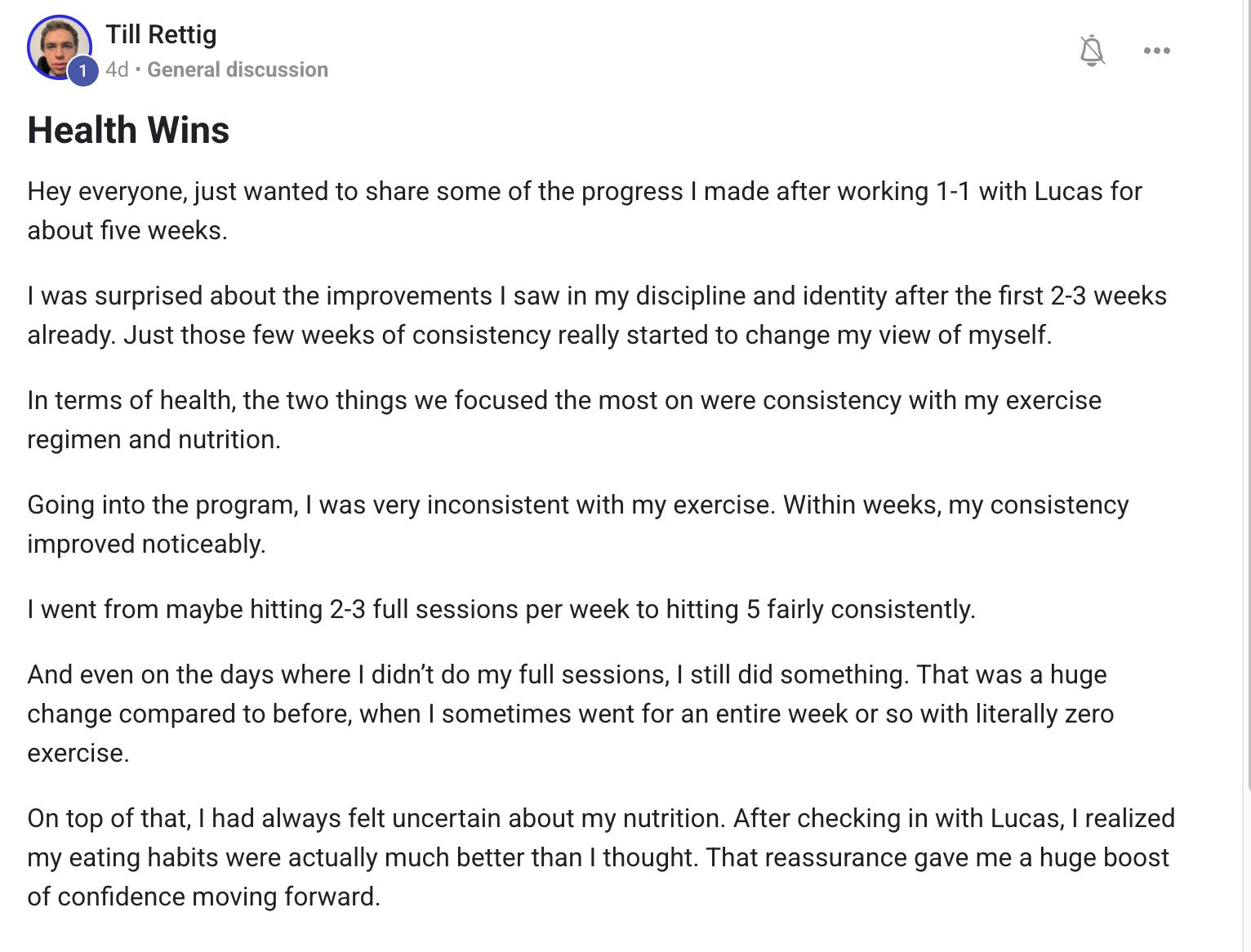 This is full lifestyle and discipline coaching, with training and nutrition as tools.